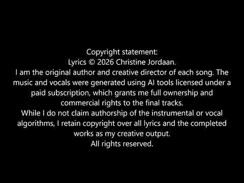 Copyright statement: Lyrics © 2026 Christine Jordaan. I am the original author and creative director of each song. The music and vocals were generated using AI tools licensed under a paid subscription, which grants me full ownership and commercial rights to the final tracks. While I do not claim authorship of the instrumental or vocal algorithms, I retain copyright over all lyrics and the completed works as my creative output. All rights reserved.